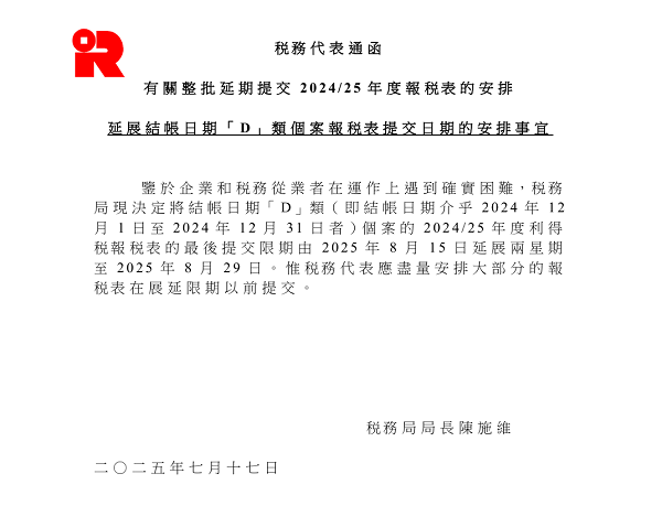 香港稅務局于2025年7月17日發布通告,鑒于企業與稅務服務機構的年底結賬操作困難,??正式延長D類公司(財務年度結束于2024年12月1日-31日)的利得稅申報期限??——由原定的2025年8月15日延后兩周至??2025年8月29日??。本次延期旨在緩解申報壓力,但需注意??8月29日為最終截止日??,逾期將面臨合規風險。
