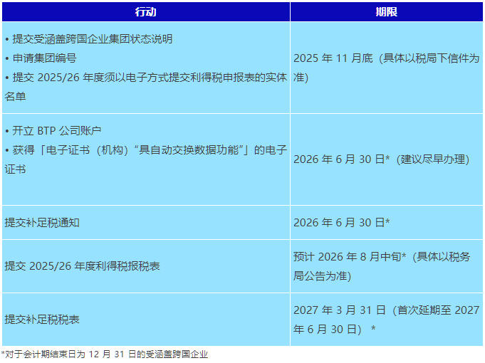 以下內容概述受蓋跨國企業集團在新制度下的相關義務以及規定期限。