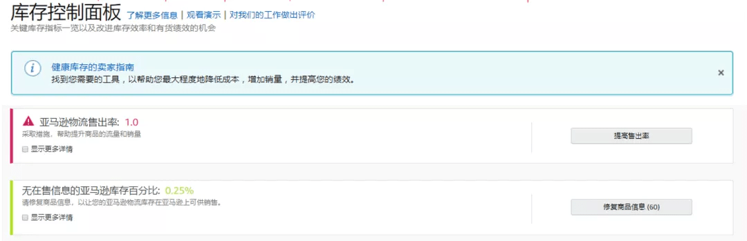 進入到【庫存控制面板】頁面,亞馬遜會根據實際情況提供對應優化建議。